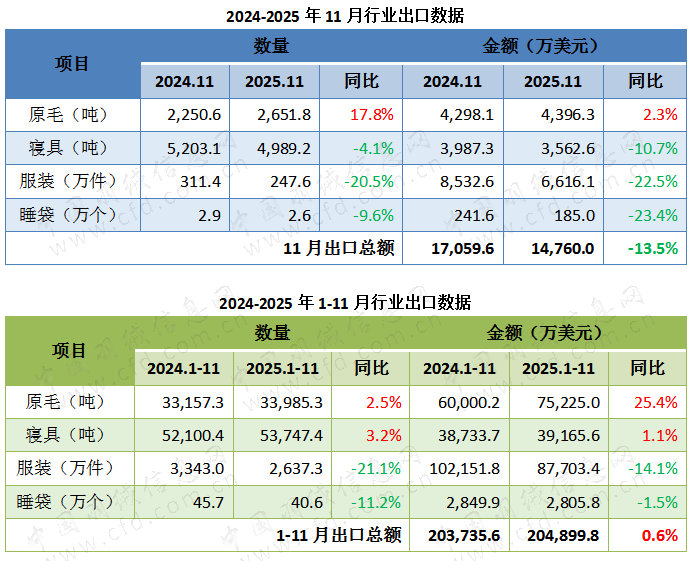 1-11月羽绒行业累计出口总额为20.5亿美元,同比微增0.6%,整体保持平稳。分品类看:原毛出口额大幅增长25.4%,表现突出;寝具出口相对稳定,数量和金额略微增长;服装出口延续疲软态势,数量和金额分别下滑21.1%和14.1%。
